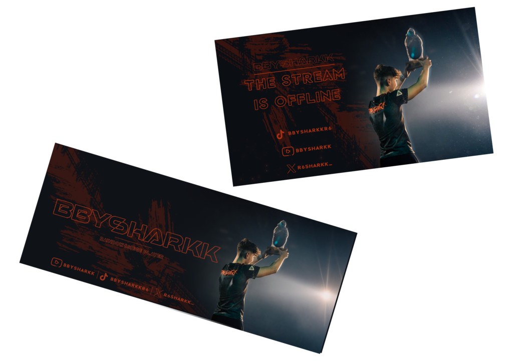 J’ai été contacté par BbySharkk, un jeune streamer sur la plateforme Twitch, gagnant de la Gamers Assembly 2024 sur le jeu Rainbow6Siege afin de réaliser 2 bannières pour ses streams. Une bannière pour sa chaine Twitch, et une autre pour prévenir que son stream est hors ligne.