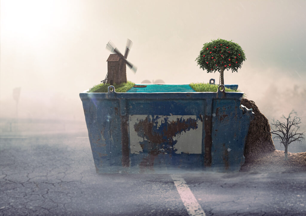 C’est un Photoshop réalisé pour le concours de la 6ème édition du Festival du Fantastique de Béziers. Le thème du concours était la métamorphose. J’ai donc décidé de métamorphoser, une poubelle qui est un objet associé à la saleté, les déchets en écosystème. C’est à dire avec de la vie, de l’eau, de l’herbe. En résumé, l’opposé d’une poubelle. Le tout sur une route délabrée, montrant que cette poubelle est le dernier signe de vie de ce monde.