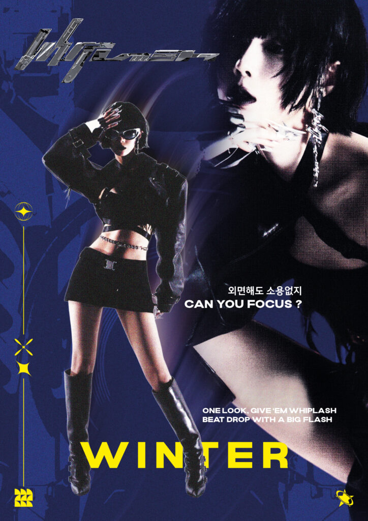 Affiche concept du groupe Aespa pour leur musique « Whiplash« . Cette affiche représente l’une des quatres membres du groupe : Winter. J’ai filmé la même affiche avec Giselle, une autre membre du groupe. Vous pouvez visionner la vidéo ici.