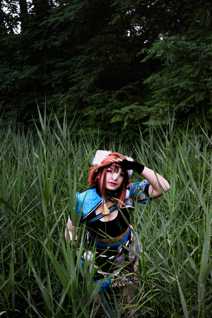 Photo Shoot d’une cosplayeuse, incarnant le personnage de Gorou dans Genshin Impact.
