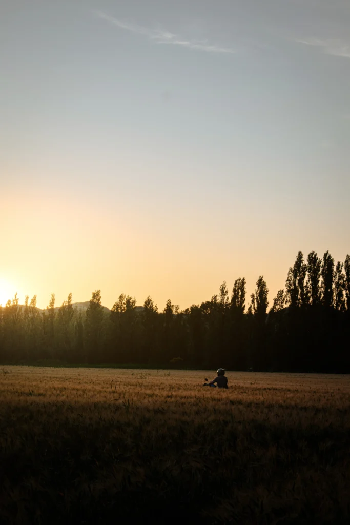 Photo shoot d’un motard traversant les champs, sous le coucher de soleil.